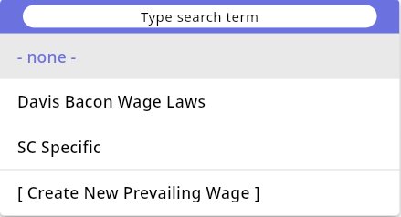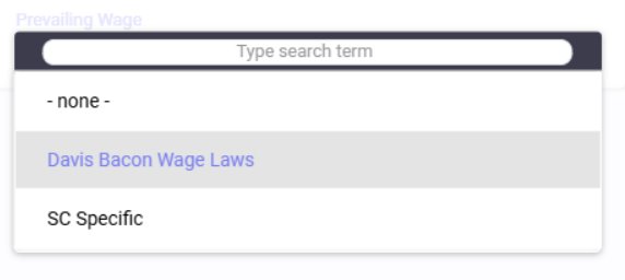 Within a project, a default prevailing wage can be set. This defaults to none applied but can be chosen from the Project Edit>Financial Tab> Prevailing Wage