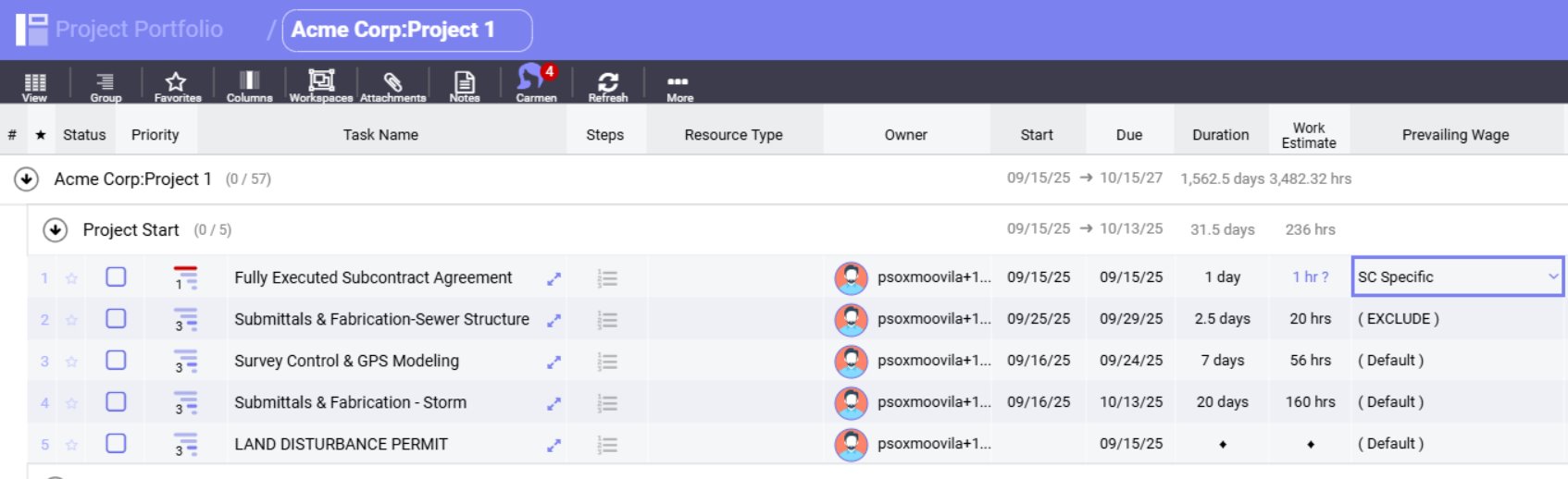 The prevailing wage set on the project is also visible from the portfolio view adding the column “Prevailing Wage” into the column selection