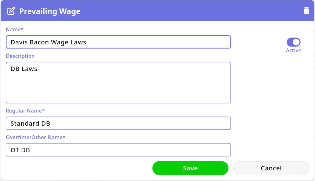 Active/Inactive Status – Defines if they see the prevailing wage available for selection on projects and tasks