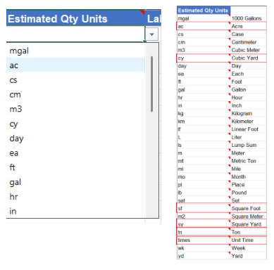 Adjust bid import abbreviations for bid import template for Estimated Quantity Units and adjust inputs to use the new versions