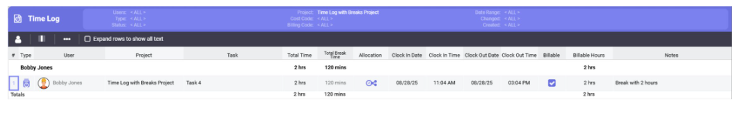 Break times on Time entries are now considered into the “Total” time calculation and will be saved to the time object appropriately