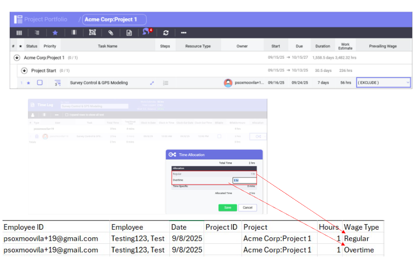 This time entry has a total of 2 hours, one regular and the other Overtime. You can see from the example below the associated prevailing wage type will be displayed in the Wage Type column
