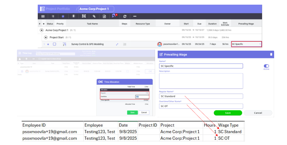 If I were to take that same task and time entry but change the prevailing wage on the task to “SC Specific”, you will see the wage types now assume that prevailing wage type and the associated prevailing wage names based on the time entry and calculated wage types