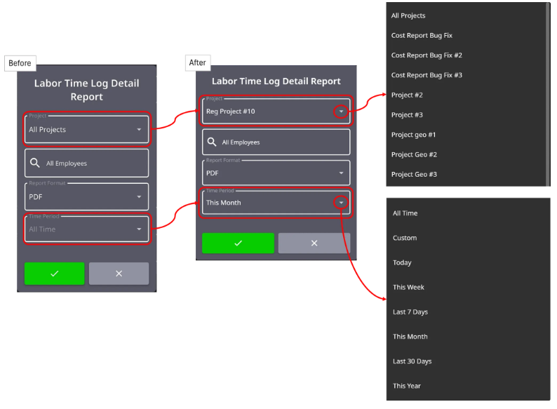 【Improvement】【Reports】Outage Countermeasures Background of the system shutdown: It is presumed that a user executed the Labor Time Log Detail report three times with “All Projects” and “All Time” selected, outputting over 10,000 records. This caused CPU usage to reach 100%, leading to the system shutdown. As countermeasures, we reviewed the output conditions for Labor Time Log Detail report and implemented the following: