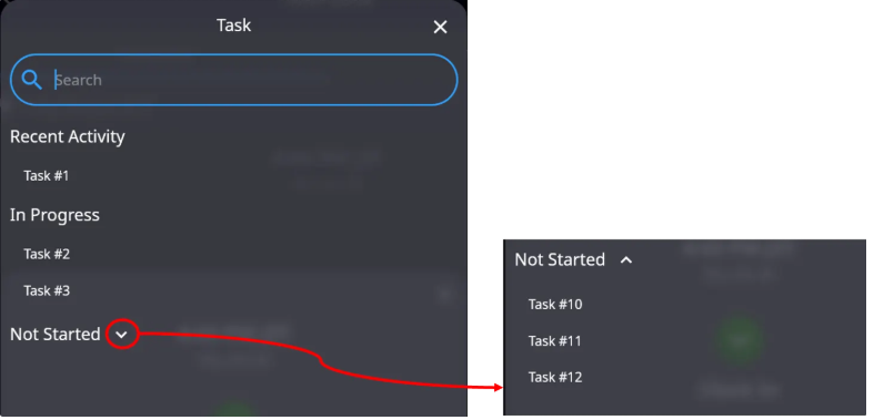 【Improvement】【Time Clock】Show Other Tasks and have it expandable, but hidden in default. Other tasks (only “not started” tasks; blocked, canceled, and completed tasks are excluded) are displayed in a collapsible format. By default, it is displayed in a collapsed state and can also be searched using filters. The name of the collapsible area is “Not Started”. Additionally, when showing filtering result, “Not Started” section is automatically expanded.