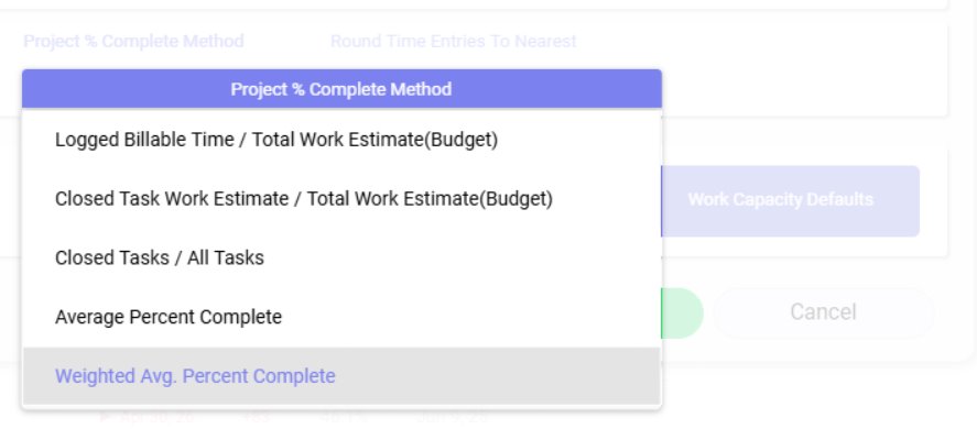 We added a new Project % Complete method: Weighted Percent Complete. Instead of averaging task percentages equally, this method weights each task by its estimated effort (hours). The result is a more accurate view of overall progress—large, high-effort tasks contribute proportionally more than small tasks