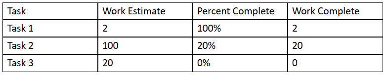 Example: Work Complete (22) / Total Work Estimate (122) = 18% Complete